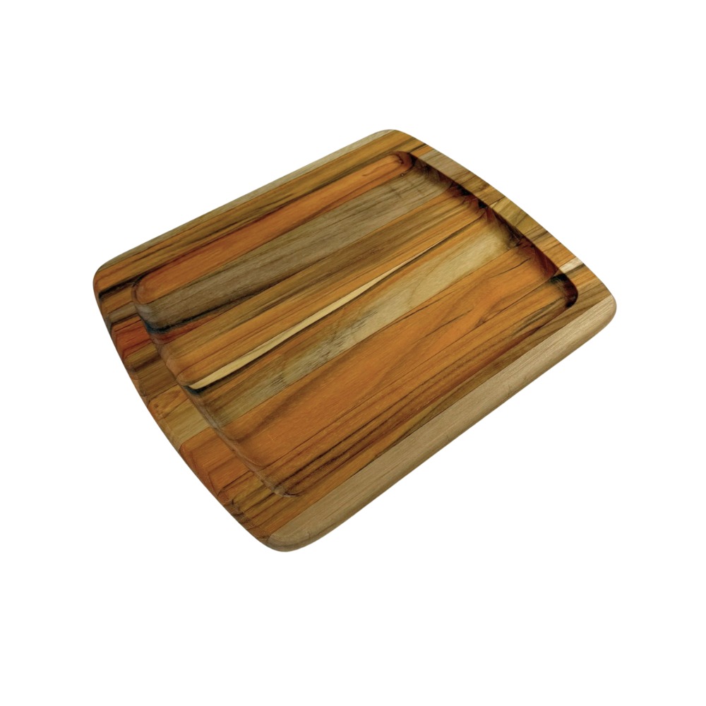 Elegant and resistant board made of natural teak wood, ideal for cutting and presenting meats, cold cuts or cheeses. Its design with soft edges and perimeter channel allows to contain juices and keep the surface clean. Perfect for those looking for quality, durability and style in their kitchen or grill.