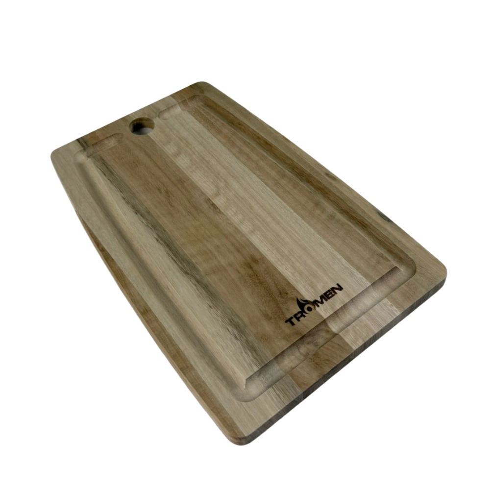 Tabla de cortar fabricada en madera de eucalipto, ideal para cortes precisos y seguros. Su superficie resistente protege los filos de los cuchillos y ofrece una excelente durabilidad. Cuenta con ranura perimetral para evitar derrames de jugos y un orificio para colgar. Diseño elegante con el logo grabado de Tromen, perfecta para parrilla o cocina. Combina funcionalidad, estilo y calidad profesional.
